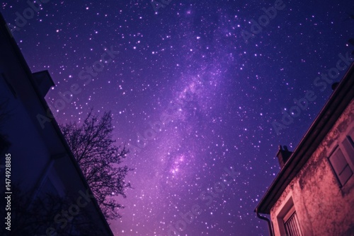 © Sarinya, Fototapeta premium Milky Way over Rooftops at Night, Low Angle, Purple Sky, Starry Sky, Long Exposure, Urban Nightscape