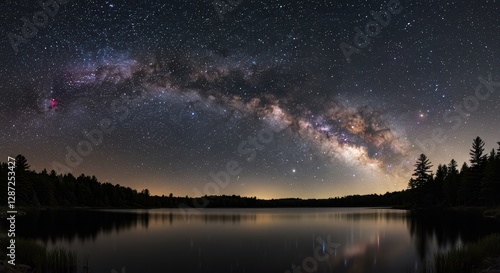 © IbragimovN, Naklejka premium Milky way over tranquil lake with pine forest silhouette and starry night sky