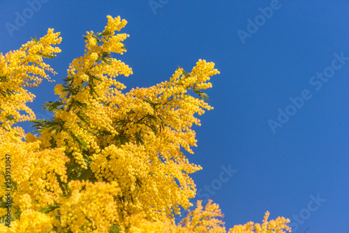 © JonShore, Fototapeta premium Mimosa Flowers Blooming in the Spring Against a Blue Sky