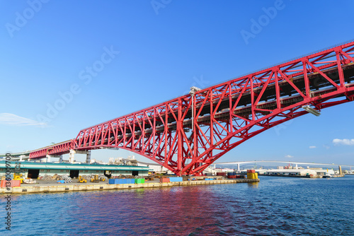 © Pat, Naklejka premium Minato Bridge in Osaka.the symbol of Osaka Harbor, Red big bridge in Osaka, the largest truss bridge in Japan.