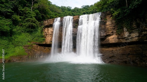 Obraz premium Mindful living serenity positivity concept. Lush waterfall cascading into a...