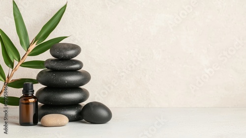 Fototapeta premium Mindful living with wellness and consciousness concept. Serene spa setting with stacked stones and essential oil bottle.