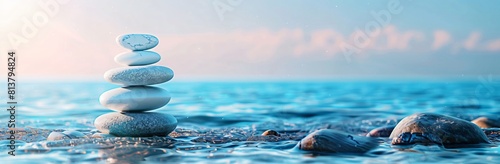 © AgungRikhi, Obraz premium Mindfulness and meditation - stacked stones on the seas shore, blue background with copy space, banner design. The concept symbolizes balance and harmony in life.