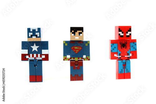 © wesleyyaya, Fototapeta premium Minecraft Characters: Captain America, Superman and Spider-Man. Assemble toy.