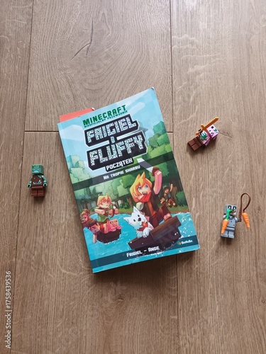 © Everyday Frame, Naklejka premium Minecraft Friciel et Fluffy Book with Minecraft Toys on Wooden Background - Editorial
