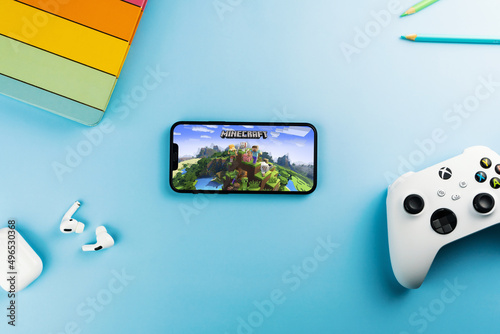 © Diego, Fototapeta premium Minecraft mobile game app on the smartphone screen. Blue background with school supplies, AirPods, video game controller. Rio de Janeiro, RJ, Brazil. April 2022