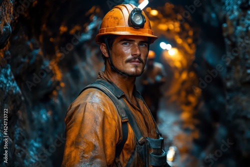© Fajar, Fototapeta premium Miner in Action A Portrait of a Worker in a Dark Tunnel with Safety Gear and Headlamp