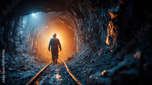 Fototapeta premium Miner Walking Through Dark Tunnel with Bright Light at End, Mining Industry...