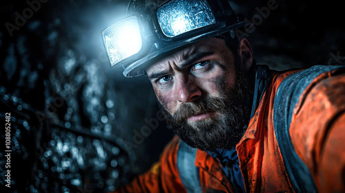 © kongkiat chairat, Fototapeta premium miner with headlamp inspects dark underground tunnel, showcasing determination and focus. rugged environment highlights challenges faced in mining