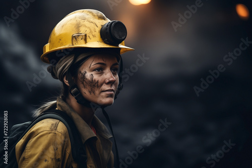 Fototapeta premium Miner woman professional mining worker working in the mine. Excavation operation with work clothes and hard safety helmet.