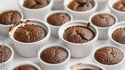 © Swaroop, Fototapeta premium Mini chocolate lava cupcakes in white ramekins, fudgy center, gourmet-style individual dessert
