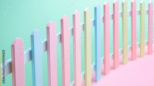 © Samady, Obraz premium Mini fences in pastel pink, blue, and green standing in a curved pattern.