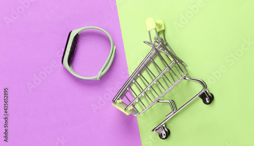 Fototapeta premium Mini shopping trolley with smart bracelet on pink green pastel background. Modern gadgets. Top view