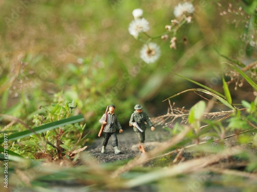 © awstoys, Obraz premium Mini toy of action figure at outdoor with blurred background. Toy photography concept design. Minifigure of hunter man character at forest with weapon, hat and face mask