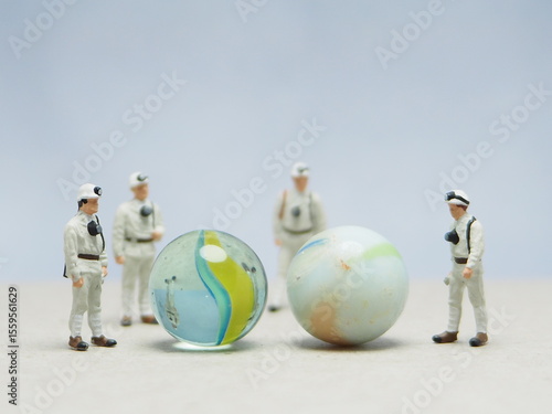 © awstoys, Obraz premium Mini toy of action figure at outdoor with blurred background. Toy photography concept design. Minifigure of scientist character with marble stone. People wear hazmat suit.