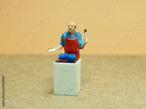 © awstoys, Naklejka premium Mini toy of action figure at with blurred background. Miniature photography concept design. Minifigure of chef character cooking at kitchen.