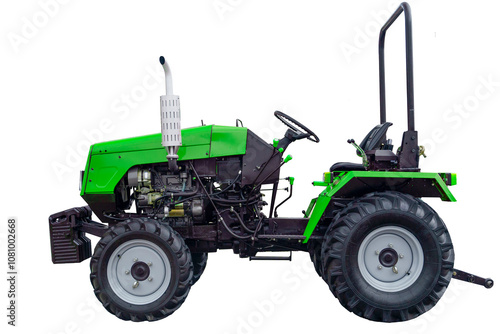 © uladzimirzuyeu, Obraz premium Mini tractor isolate. Farm tractor for agricultural work on empty background