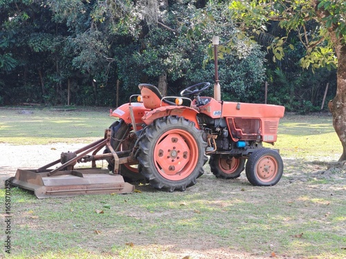 © Aliste7484, Obraz premium Mini tractor parked under tree in green field