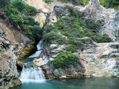 Fototapeta premium Mini waterfall tucked away in a forested area on a bright day, with extended...