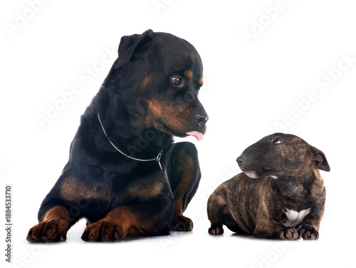 Fototapeta premium miniature bull terrier and rottweiler