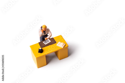 © twixx, Obraz premium Miniature businessman behind desk at the office