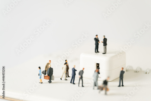 Fototapeta premium Miniature businessman shake hand partner client customers on stage with success dealing business using as contract commitment agreement investment and partnership business development joint venture