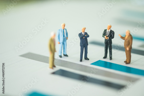 © Dontree, Obraz premium Miniature businessman standing on the report graph of business direction strategy.