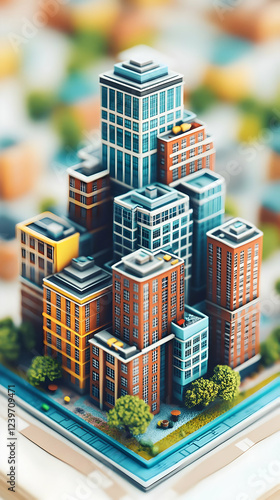 © Siasart Stock, Obraz premium Miniature Cityscape Stands on Map, Showcasing Urban Planning with Architectural Models.