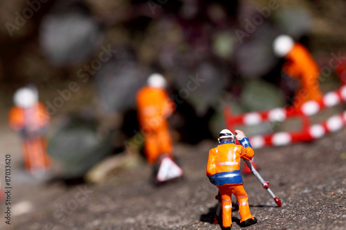 Fototapeta premium Miniature construction workers weeding. Miniature scale model construction...