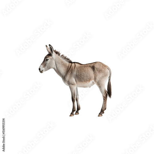 Fototapeta premium Miniature Donkey Profile: A charming miniature donkey, standing in profile view, showcases its soft, light brown coat and distinctive features against a clean background.