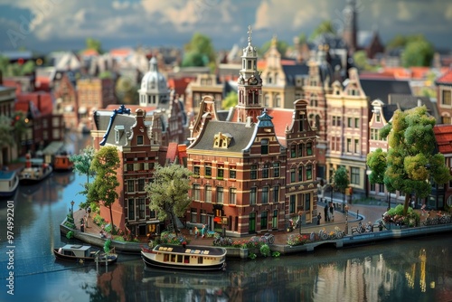 Naklejka premium Miniature dutch city with canals, bridges, and traditional houses is bathed...