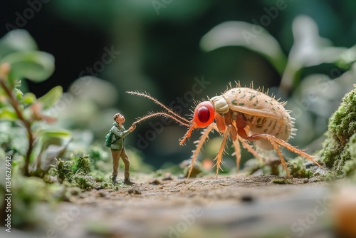 Naklejka premium Miniature figure encounters enormous insect, lush background.