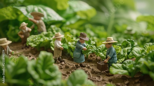 Obraz premium Miniature figures tending to a lush green vegetable garden.