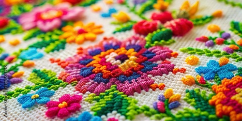 Fototapeta premium Miniature Floral Cross Stitch Embroidery, Whimsical Needlework, Close-up,...