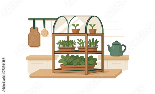 Fototapeta premium miniature greenhouse shelf kitchen sustainable microgardening solution flat vector illustration style isolated on white background