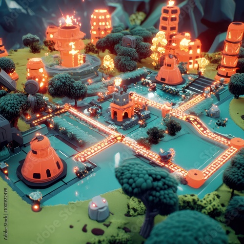 Obraz premium Miniature Model of a Futuristic City with Glowing Structures and Pathways