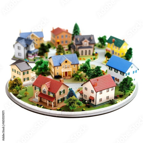 © Ranti, Obraz premium Miniature model of a residential neighborhood. Colorful houses, trees, and roads on a circular base