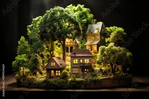 Fototapeta premium Miniature model village with tiny houses, lush trees, and warm lights on a dark background