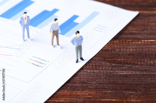 © 5second, Obraz premium Miniature people and financial papers with graph and charts on brown wooden table
