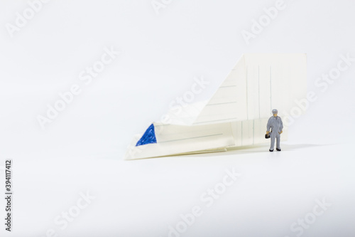 © Werachat, Obraz premium Miniature people : Close up engineer with paper airplane isolated on white background