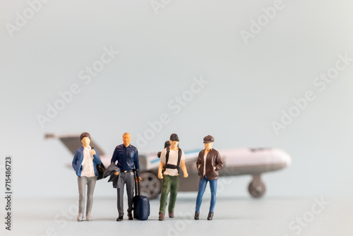 © Sirichai Puangsuwan, Fototapeta premium Miniature people, travelers embarks on a delightful vacation, gleefully boarding a tiny airplane