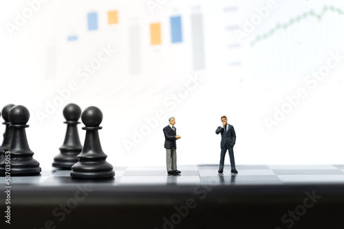 © Sukanya, Obraz premium Miniature people, two businessmen stand on chessboard with graph on background. Business and financial concept