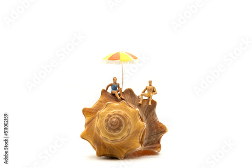 © Sirichai Puangsuwan, Naklejka premium Miniature people wearing swimsuit relaxing on seashells with white background , Summer Time concept