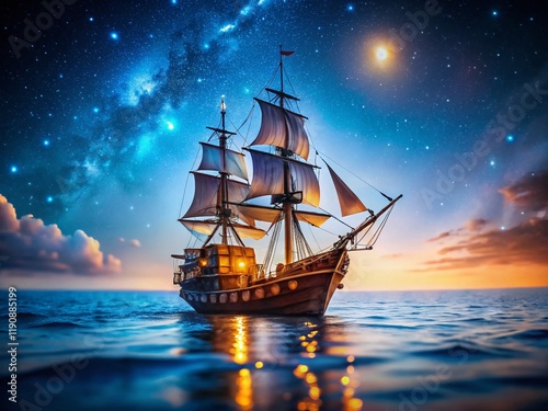 Fototapeta premium Miniature Pirate Ship Sailing Calm Night Sea - Tilt-Shift Photography