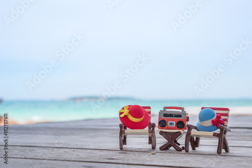 © grooveriderz, Naklejka premium Miniature radio on a table and beach chair with sea background.