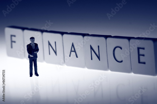 © Christian, Fototapeta premium Miniature scale model businessman standing in front of the word finance on tiles.