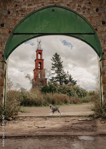 © Anya, Fototapeta premium miniature schnauzer salt and pepper dog on background castle