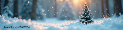 Naklejka premium Miniature snow-covered forest with a small Christmas tree, cold climate,...