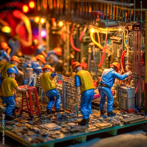 © Budi, Naklejka premium Miniature Workers on a Circuit Board