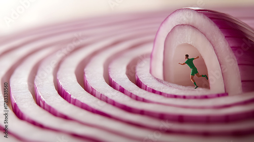 © A2Z AI , Fototapeta premium Miniature world: a runner sprints through a giant red onion slice tunnel, layers creating an abstract background. Conceptual macro photography shows scale and imagination.